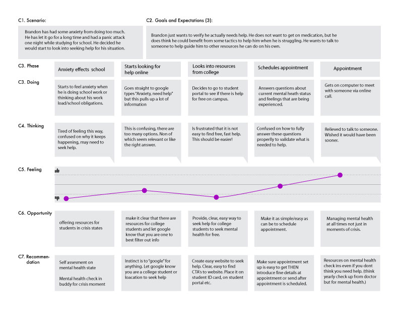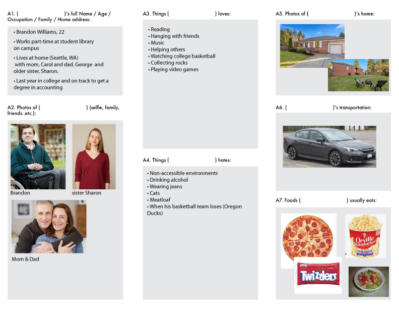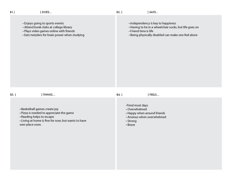This is some progress work on researching/developing a persona for the mental health website for college students. With the target audience of college students in mind, I developed a persona who also has a physical disability. After research and using different design models, I realized although he has a physical disability the way that he would utilize the site is not much different than the average college student. Which is how my design thinking shifted from focusing on the disability to focusing on my users needs and likes. One of them being his love for pizza. Which will be the next round of iterations. Focusing on mapping out my idea for combining college student’s love for pizza with engagement in mental health resources.