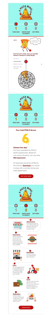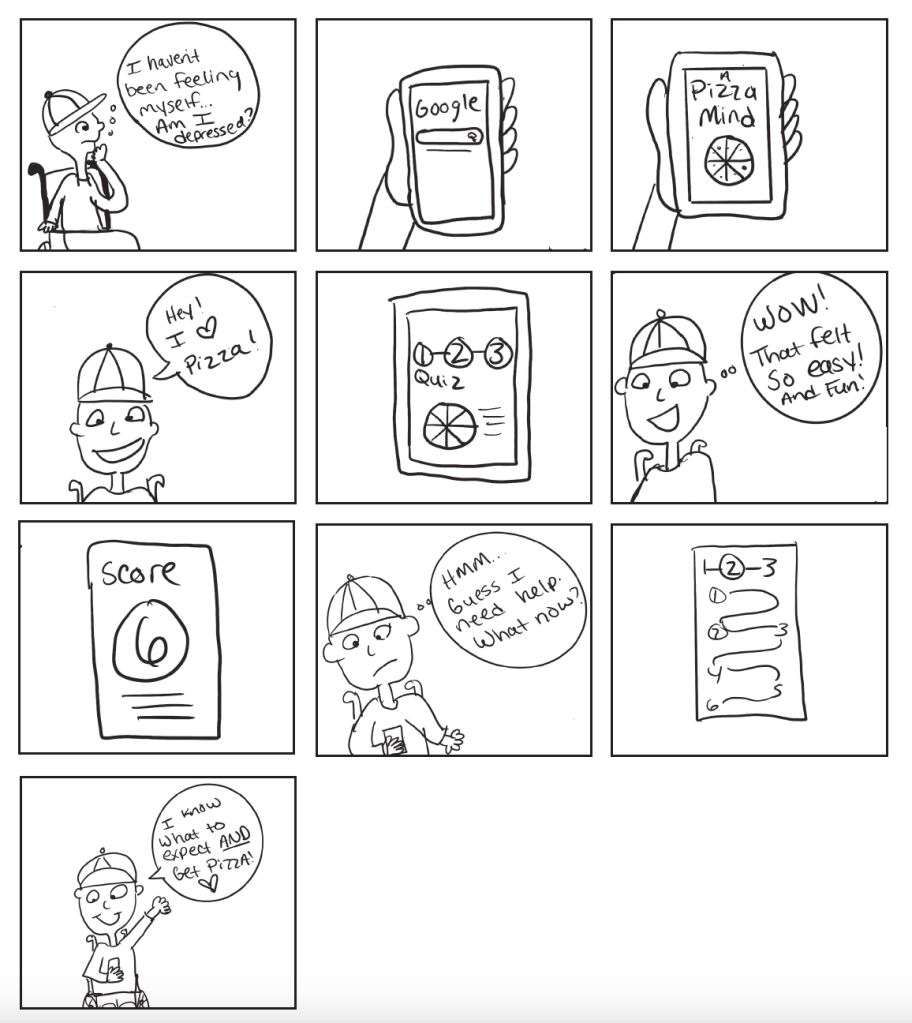 • A concept scenario was created to show how the user would engage and interact with A Pizza Mind app. I tried to think of the user and what they may say during their initial impressions when using the application.
