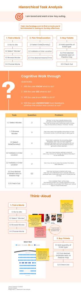 • The assignment goal was to go to fandango.com and create a hierarchal task analysis for finding a movie on a Sunday afternoon. Below is the process I went through to create my analysis.